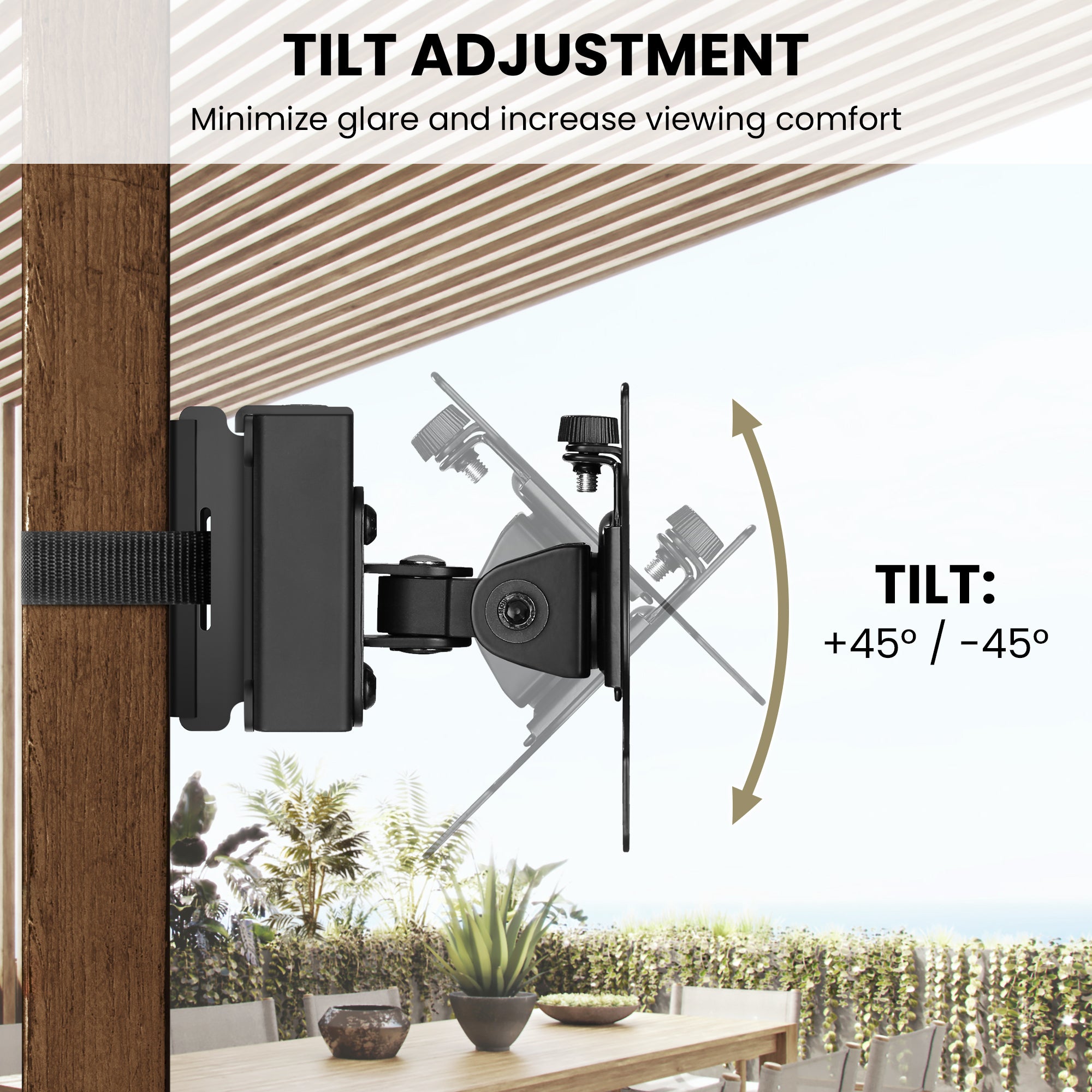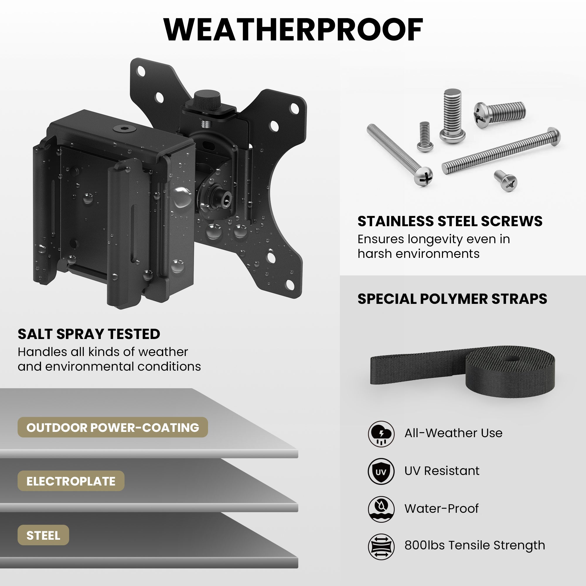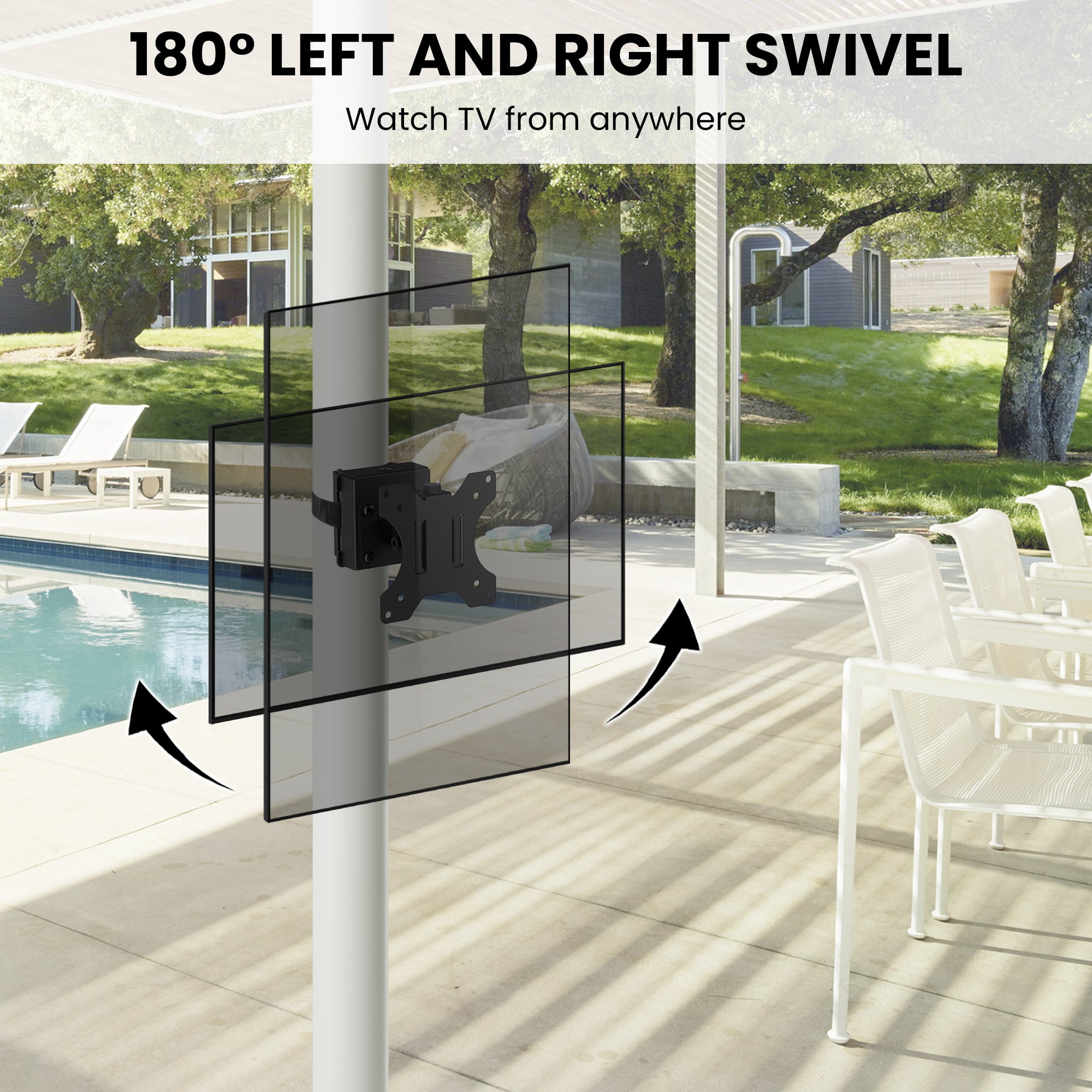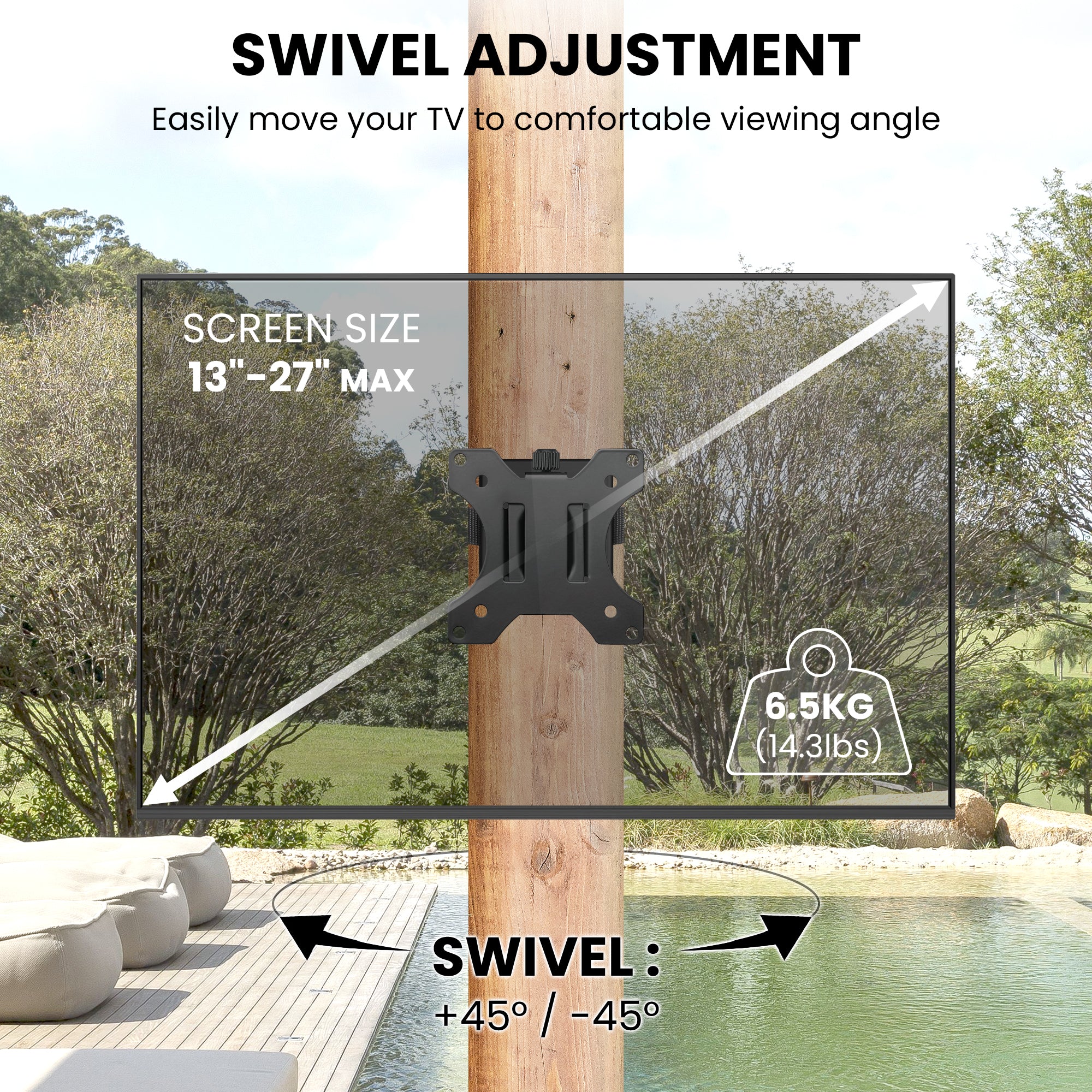 Crafted with weatherproof, outdoor-rated materials, ZEBOZAP ensures long-lasting durability in rain, sun, and dust. The sturdy frame supports up to 18 lbs, keeping your screen secure while offering tilt and swivel adjustments for the best viewing angles.